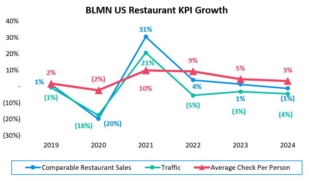 The cracks began forming immediately. While Texas Roadhouse and Chili’s anchored consumer expectations with consistent value offerings, Bloomin’ dawdled with its promotional response. Menu prices climbed 3-6% annually without corresponding improvements in food quality or service experience. The predictable result? Collapsing traffic.