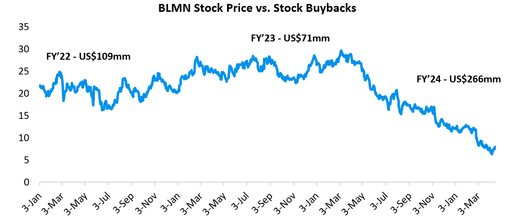 The brand lost relevance years ago. While Texas Roadhouse and LongHorn evolved, Outback doubled down on nostalgia and stopped listening. They jacked prices while doing absolutely nothing to improve the product. Then, management decided to use ~$450 million on share buybacks when they should’ve been fixing their restaurants.