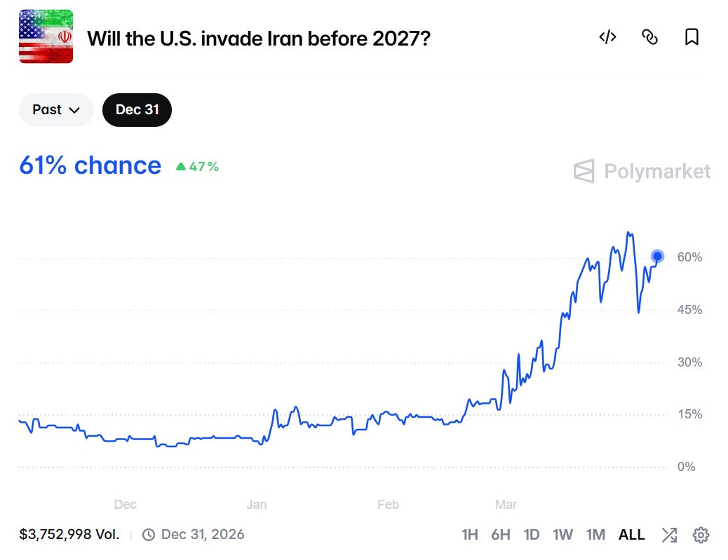 On Iran, the honest answer is nobody knows. Polymarket is pricing a 61% chance of ground invasion before 2027. Trump is threatening to bomb power plants. Iran rejected the Hormuz ultimatum and says the strait reopens only when war damages are fully compensated. Kuwait’s oil infrastructure got hit again over the weekend.