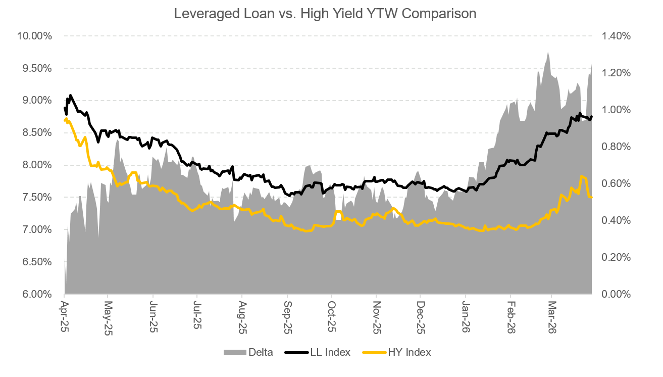 Loan yields came in around 8.75% this week, ~125bps above high-yield bond yields. The one-year average gap runs closer to 66bps and it normally runs in HY’s favor. Loans are floating rate, senior secured, shorter duration. They should yield less than bonds. Right now they yield substantially more.