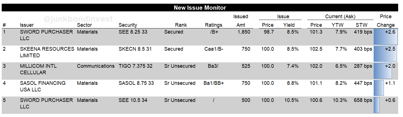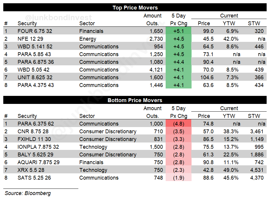 In the secondary, top movers included PARA/WBD, NFE, and UNIT, which rallied on M&A speculation. The bottom of the table was more telling: CNR hitting record lows, ION under pressure from the same AI overhang weighing on software credit broadly, and XRX debt weak.