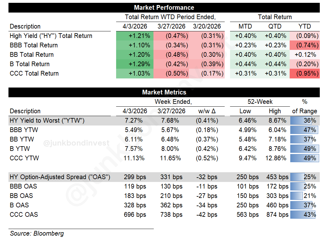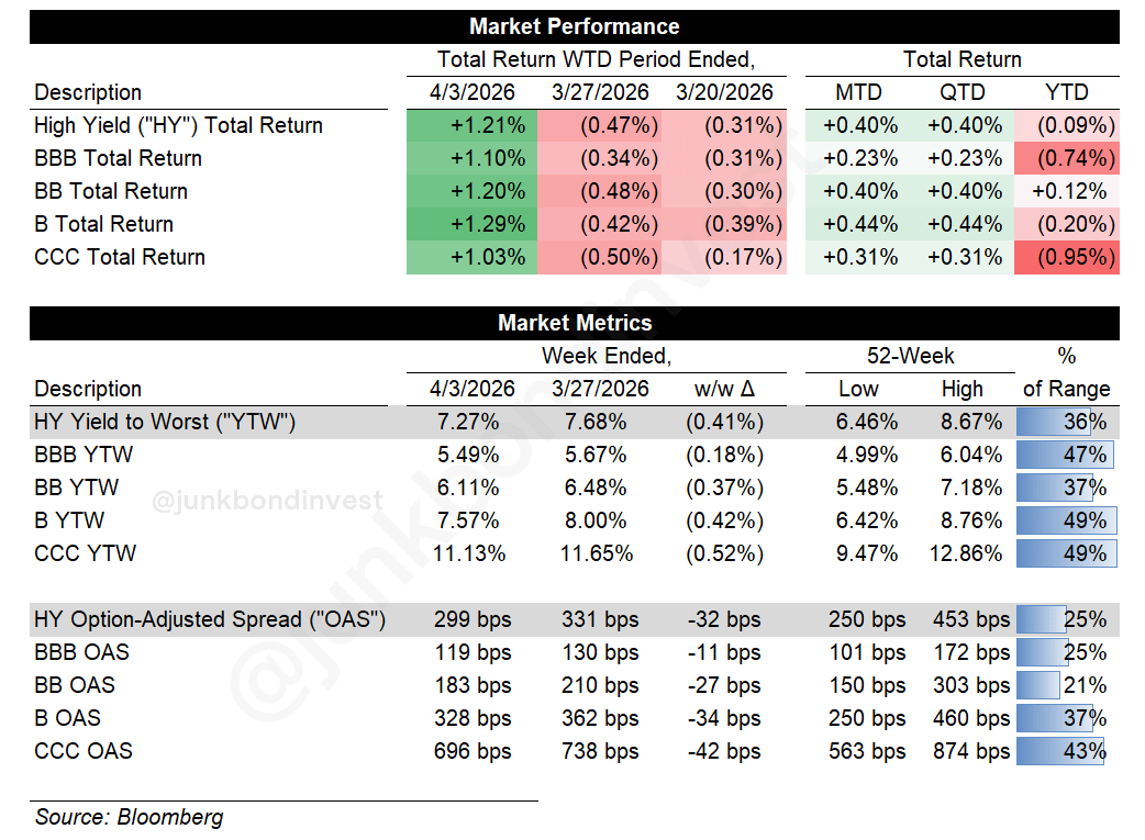 HY spreads tightened roughly 30bps this week. Index yields fell from 7.68% to 7.27%. Equities rallied hard, SPX up nearly 4% from the lows. VIX down too. The 10-year drifted back toward 4.3%. The market recalibrated from pricing a potential hike to none.