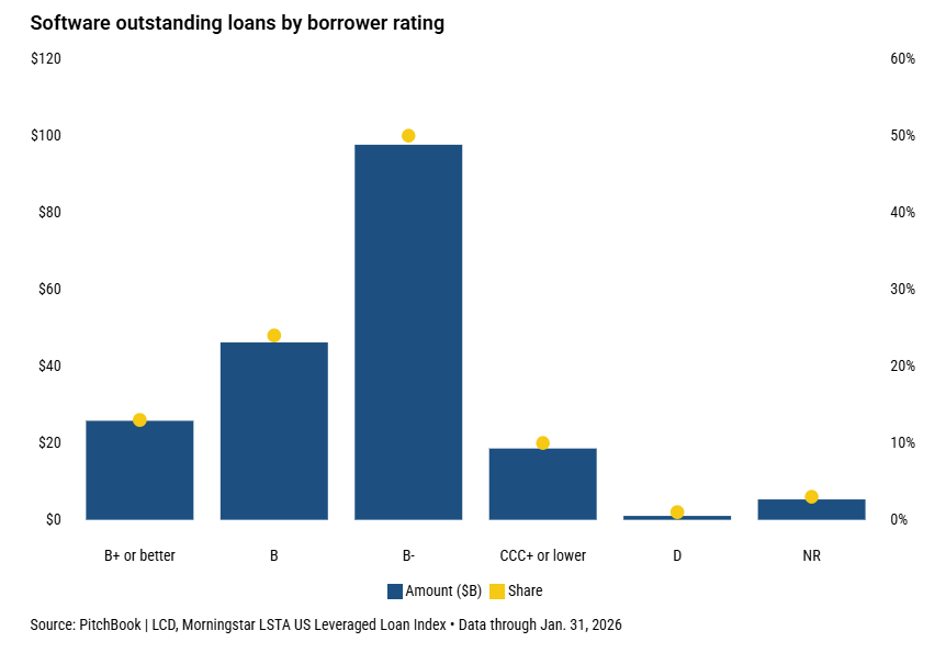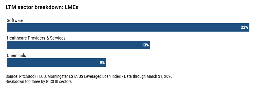The bottom chart tells that story clearly. The software sub-index sits at 89 cents vs. 95 for the broad loan index. The divergence opened sharply in early 2026, partially recovered in March, and remains wide. The stabilization is real. It’s not a resolution.