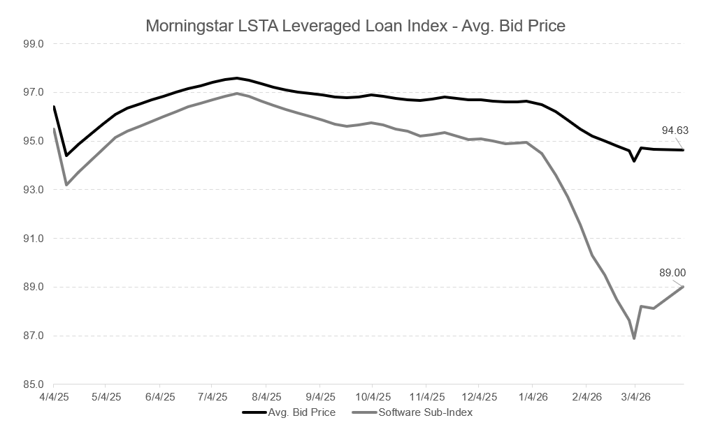 Software loans gained just over 1% in March, best month in nearly a year. Still down close to 6% YTD. The bounce got attention. The structural problem underneath it didn’t.