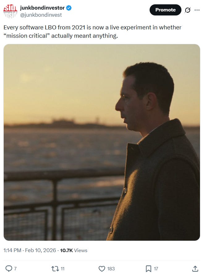 Camp Two: the market is indiscriminately selling. “Mission-critical” platforms with embedded enterprise workflows, high switching costs, and proprietary data are not going to be replaced by a chatbot.