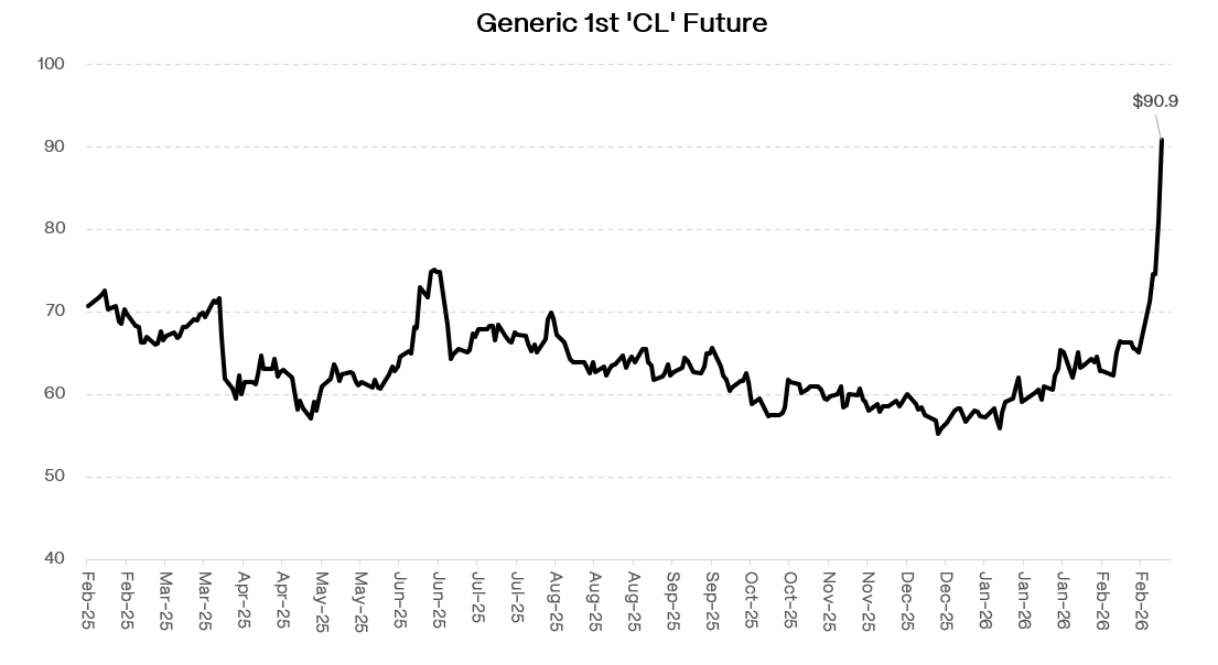 Then oil moved ~30% in a week and the conversation changed entirely. The forward curve is still pricing meaningful cuts by year-end. Payrolls at -92,000 would normally be the green light. With $90 oil and rising break-evens it is not. Cutting into that environment risks unanchoring expectations in a way that makes the problem structurally worse.