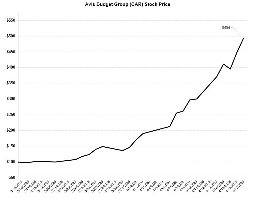 The stock roughly doubled from late February through early April on the ownership math alone, moving from around $97 to $190 before Iran escalated on April 7. Everything Avis did beyond the rental car tailwind was the squeeze.