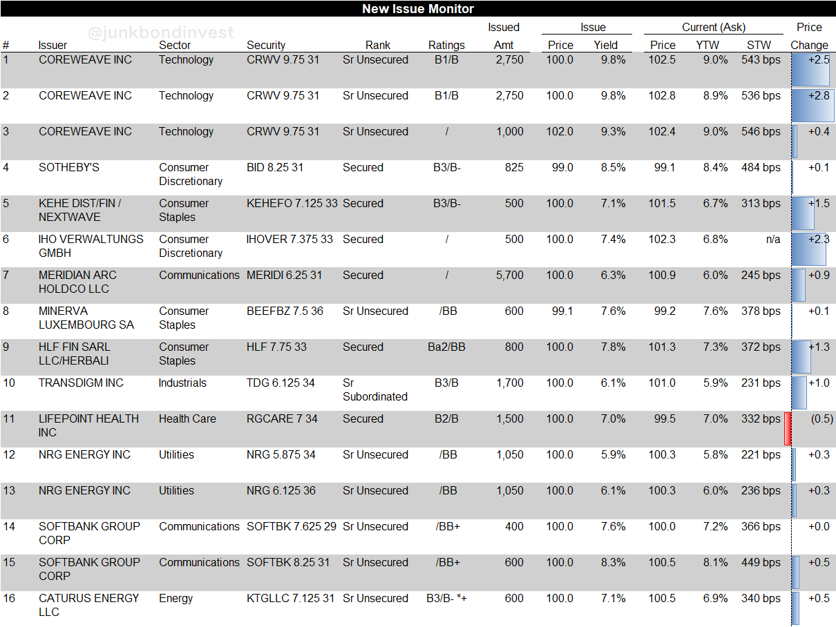The primary pipe is telling you risk appetite is back. Meridian Arc clearing at 6.25% secured. CoreWeave printing a $1bn add-on on top of last week’s deal. SoftBank tapping for OpenAI funding. Sealed Air pricing $1.85bn in 8.25% ‘33s. LifePoint Health upsizing to $1.5bn at 7%. These are issuers accessing a market that was half-shut a month ago.