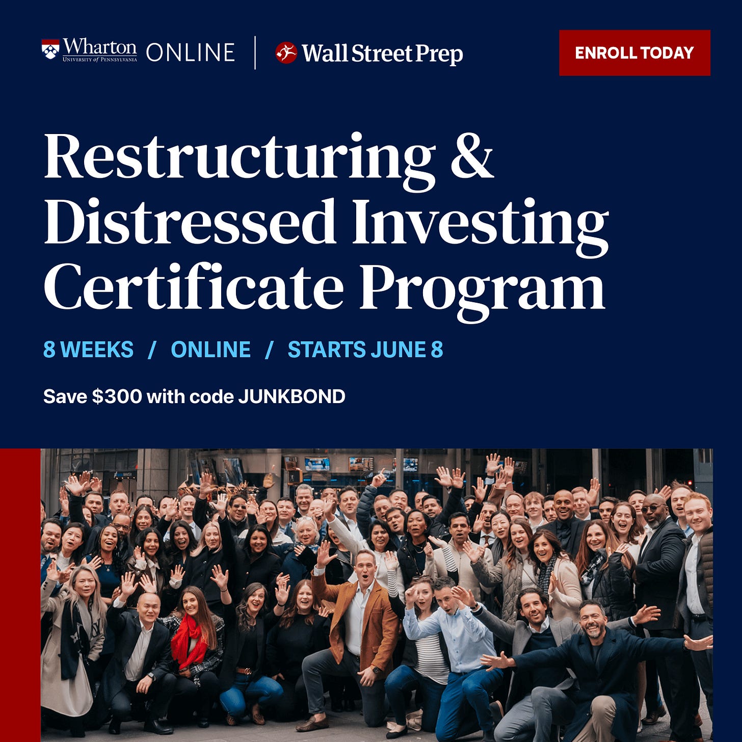 I recently partnered with Wharton Online and Wall Street Prep on their Restructuring and Distressed Investing Certificate Program. Relevant timing given the current market backdrop in software and building products. The program covers capital structure, bankruptcy mechanics, and distressed investing, led by practitioners at firms like Silver Point and Ropes & Gray. Code JUNKBOND gets you $300 off, with another $200 off if you enroll by May 11. Starts June 8.