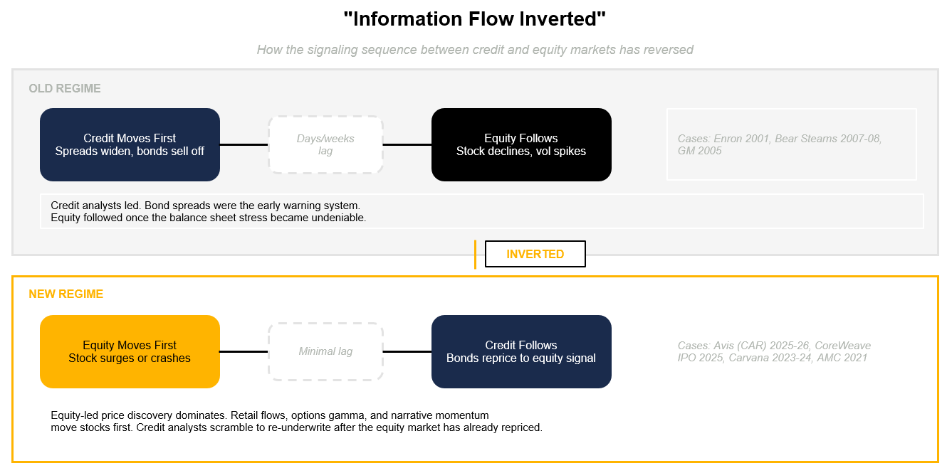 That inversion doesn’t typically apply to IG or most of performing HY credit. But for a subset of public credits, equity is the leading indicator and credit is the price-taker. That’s a meaningful change in how information moves between markets, and it has consequences for where analytical effort actually produces edge.