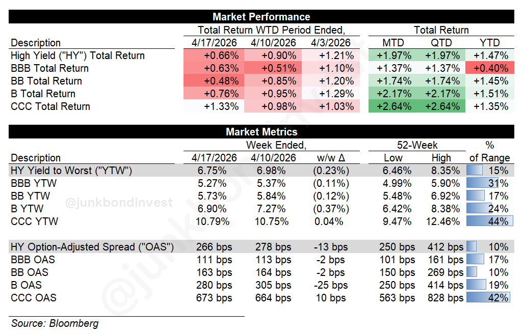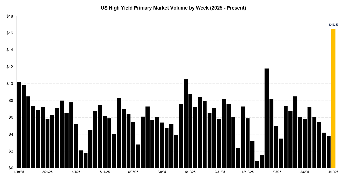 HY primary printed $16.5bn across 16 tranches. Biggest week in the last 2 years. Meridian Arc’s $5.7bn AI data center deal was the largest AI-driven HY print on record. CCCs led gains. 2026 supply on pace to be up 25% year-over-year. The Iran ceasefire opened a window and stressed paper got bid aggressively.