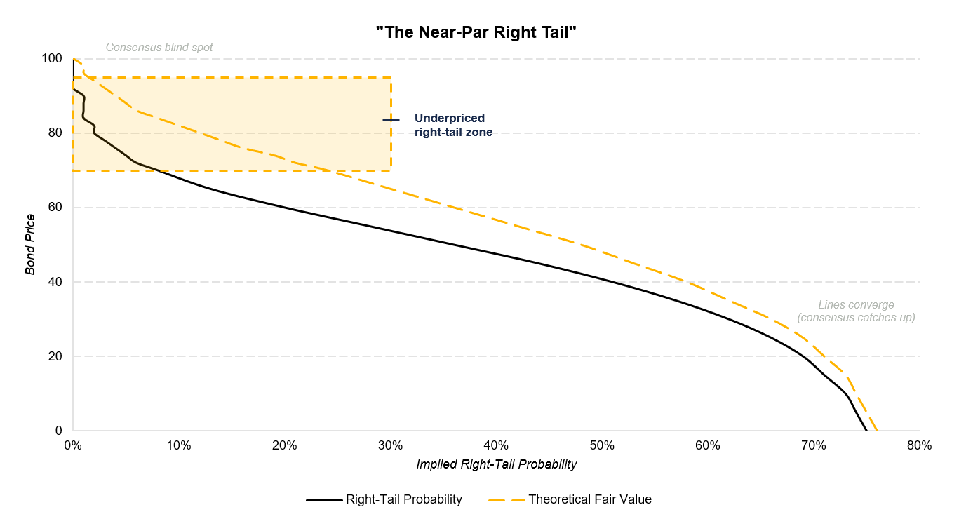 Where the bias shows up is the right-tail probability, and it gets ignored more systematically the closer a bond trades to par. At 40 or 50, distressed investors are already running right-tail scenarios. They have to. That’s the job at that dollar price. At 85 and above, with the credit stressed but not yet distressed, the analyst is still running the near-par playbook. Downside scenarios get modeled. The right tail gets underweighted.