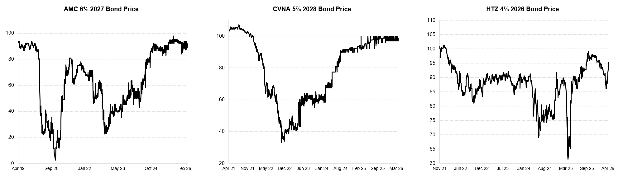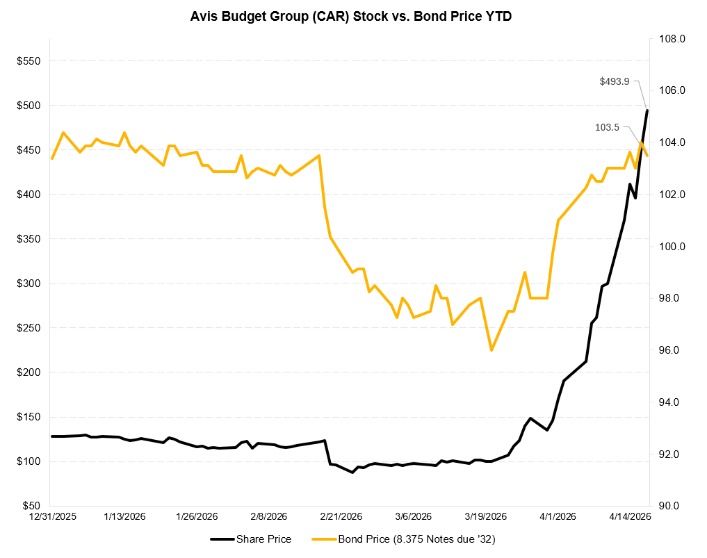 On the way up, that looks like what’s happening at Avis. A squeeze, an ATM, a recap that wasn’t in anyone’s model. On the way down, it’s the mirror: an equity narrative cracking before the credit metrics do, bonds repricing lower because the story changed rather than because the business did.