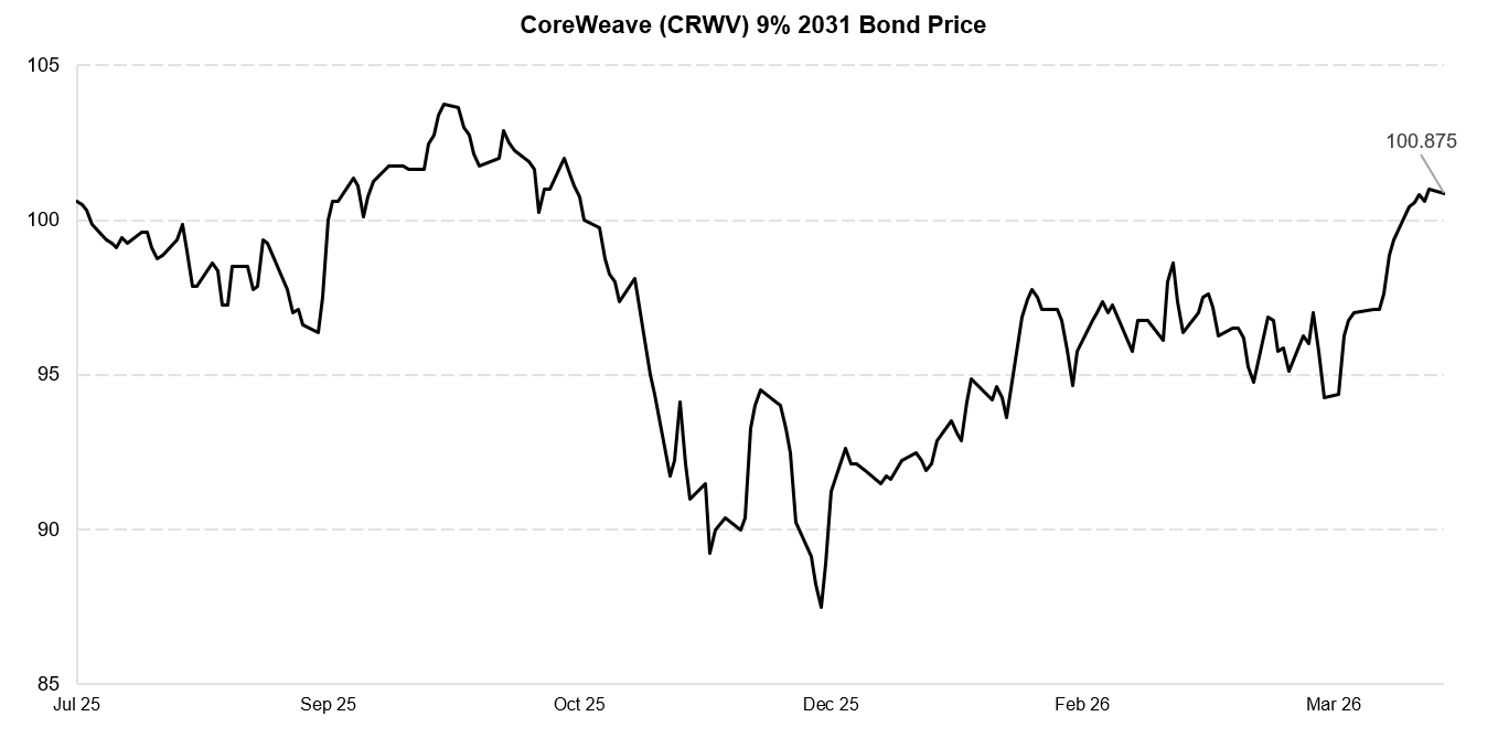 AI datacenters are the cleanest current example outside the Avis pattern. The subsector of HY is massively outperforming the broader index YTD. CoreWeave’s 9% ‘31s are up almost 4 points in two weeks on no meaningful change in credit fundamentals. What changed is the equity narrative around AI capex and hyperscaler counterparties. The credit followed the equity.