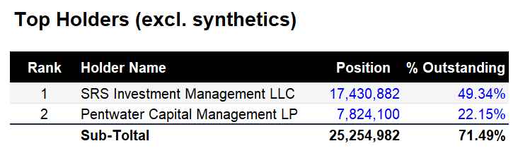 In late February, Pentwater Capital disclosed a 10% stake in Avis. An April Form 4 showed the direct stake had grown to 22%, plus synthetic exposure through cash-settled total return swaps. Combined with SRS Investment Management’s 49% position, two holders controlled over 70% of the shares directly, and more than 100% once the synthetics were layered in.