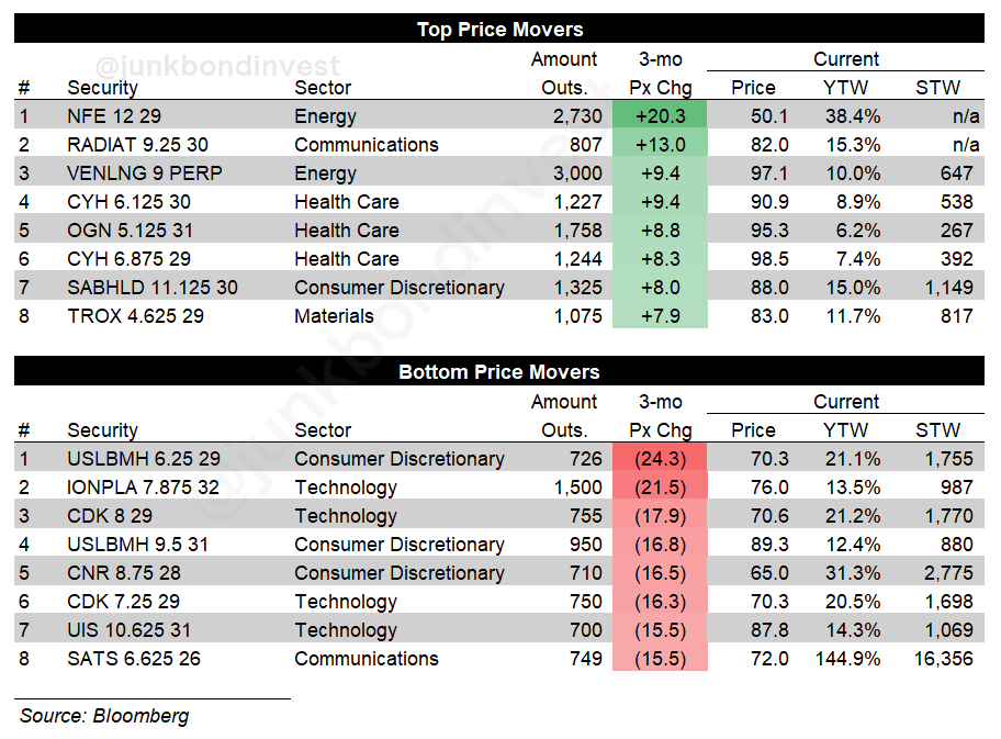 The same split shows up in this week’s tape. A primary market running hot for risk-on paper, left-tail names still grinding lower, and the biggest single-name moves sitting in distressed credits that got repriced on non-fundamental catalysts.