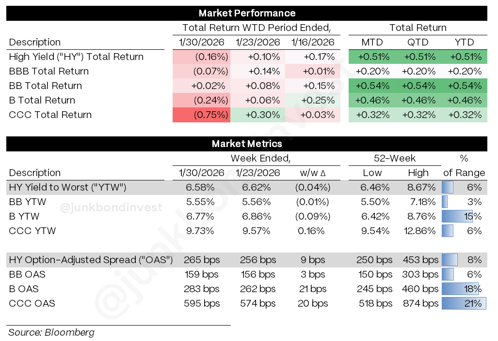 High yield returned -0.16% as Tech pain hit lower-quality credit. CCCs lost 75 bps, Bs dropped 24 bps, BBs barely held positive. Spreads widened 9 bps to 265. Sponsor-backed software paper got hammered across the board. Private credit is feeling it too: one major BDC cut NAV by 19%, another allowed redemptions well above normal caps. The Fed held and sounded comfortable staying put. Warsh got the nod for Chair. Consumer sentiment is souring. January primary cleared ~$30 billion; Sealed Air and EA still on deck.