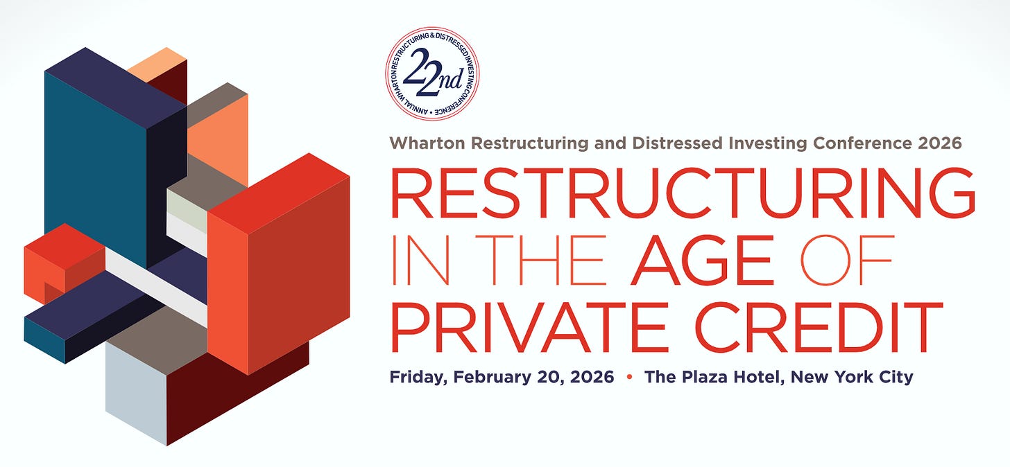 The Wharton Restructuring and Distressed Investing Conference is February 20 at The Plaza Hotel in NYC. Given this week’s theme, the timing feels apt. Use code “JBI-FREE” for 10% off. Let me know if you’re attending.