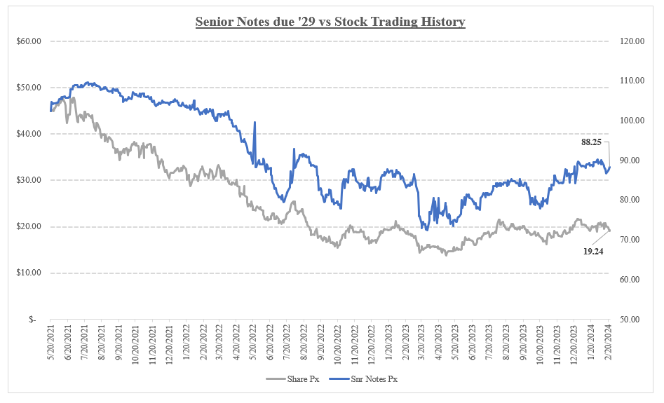 Since issuance, the company’s Senior Notes, alongside the equity, have seen considerable volatility. In March 2023, the Senior Notes saw lows of 72.5, fueled by March’s regional banking crisis (Silicon Valley Bank, First Republic, etc.) as well as a CCC credit-rating downgrade by S&P. While sentiment, alongside business performance, has improved since then, today the company’s Senior Notes due 2029 trade at ~89 for an implied YTM/STM of 10.7% / 635 bps.