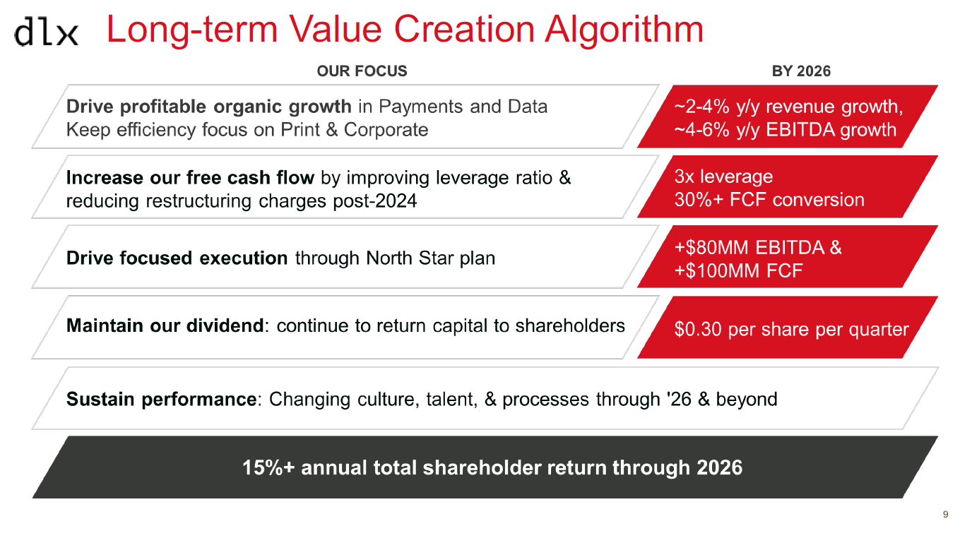 Despite the inherent risks/challenges integrating a major acquisition, Deluxe’s performance has been fairly stable, beating consensus EBITDA estimates nearly every quarter. In late 2023, the company hosted its first investor day since 2020, during which Project North Star was introduced. Under CEO Barry McCarthy’s guidance, this initiative marked a stark movement away from its traditional roots in check printing to becoming a tech-forward solutions provider for businesses and financial institutions. The plan aims to leverage Deluxe’s substantial client base, encompassing over 4 million small businesses and 4,000 financial entities, and expand into sectors like payment processing and cloud services. The North Star Plan also set ambitious financial goals, aiming to increase Adj. EBITDA by $80 million and FCF by $100 million by 2026, while continuing a strong dividend policy.