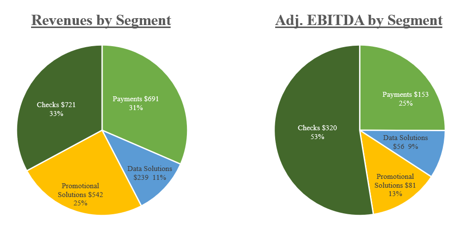 Headquartered in Minneapolis, MN, Deluxe Corp. (“Deluxe” or “DLX”) is a business services company that specializes in providing a wide range of payment processing services. Founded in 1915, Deluxe initially started as a check printing business but has since diversified through strategic acquisitions. The company currently operates across four key areas: (1) Payments, (2) Data Solutions, (3) Promotional Solutions, and (4) Checks. While revenues are broadly diversified, Deluxe’s Checks segment remains disproportionately the company’s most profitable.