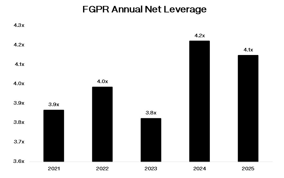 Importantly, FY’25 marked the shift from “fix the balance sheet” to “manage the balance sheet.” Net leverage ended the year around 4.1x, roughly flat y/y as growth in levered FCF offset higher interest expense.