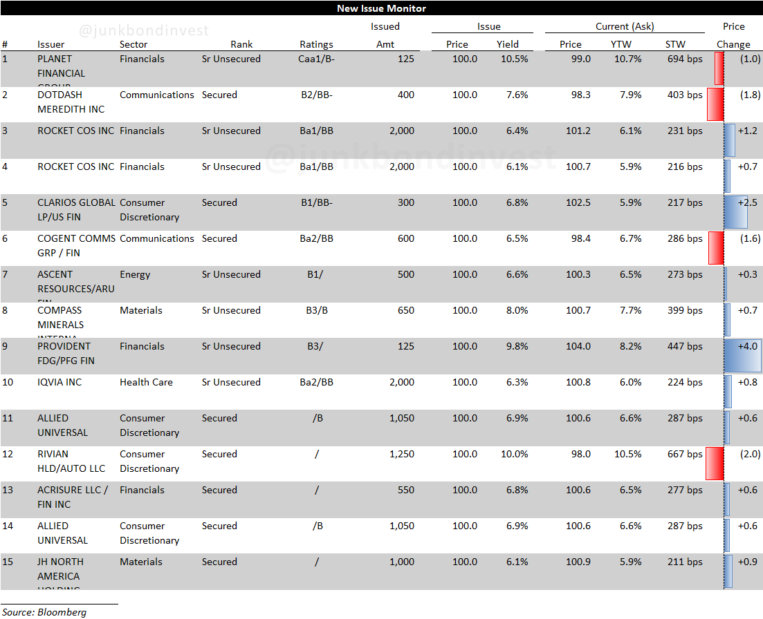 However, not every deal found smooth sailing. Several new issues including Rivian, Dotdash Meredith, and Cogent traded down on the break, with Rivian’s debut green bonds dropping two points to 98 despite pricing at par with a 10% yield. The EV maker’s cash burn and broader concerns about plans to eliminate EV tax credits weighed on secondary performance, highlighting that even in a euphoric market, if your story stinks, investors will still walk away.
