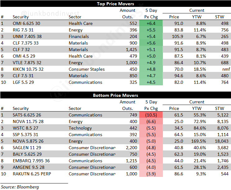 Healthcare and materials dominated the top performers, with OMI bonds surging +6.4 points and multiple CLF issues gaining 4-5+ points on steel tariff benefits