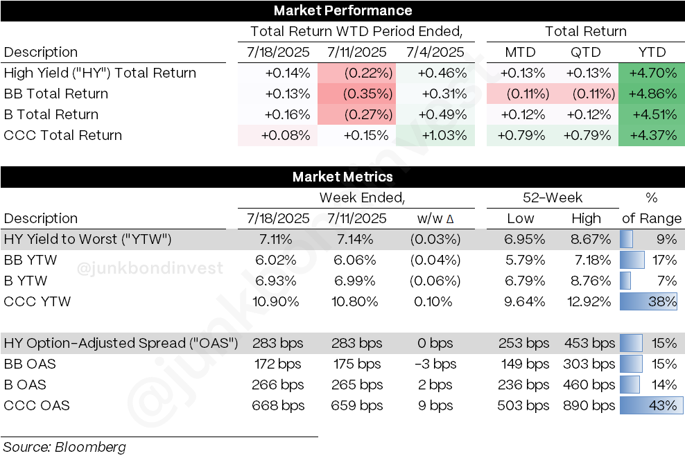 Just like that, we’re back. High yield rebounded +0.14% last week, shaking off the previous week’s rate-driven decline and proving once again that technical strength trumps temporary volatility. The market’s resilience was on full display as cooler-than-expected CPI (0.2% vs 0.3% forecast) and supportive PPI data helped stabilize Treasury yields, paving the way for risk assets to regain their footing.