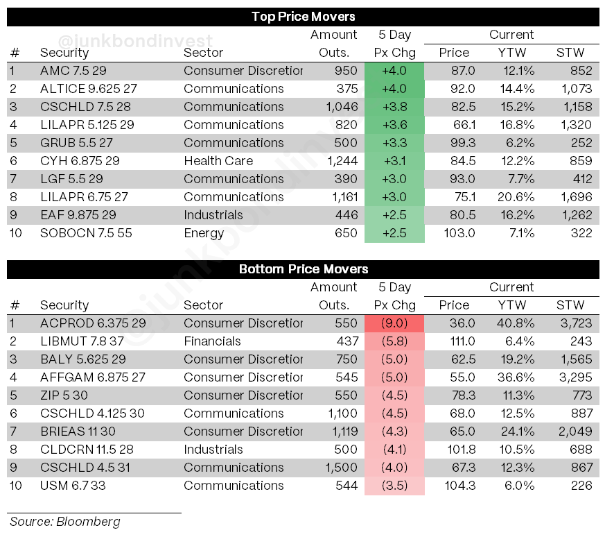 Communications dominated the weekly leaderboard with AMC (+4.0pts), ALTICE (+4.0pts), and CSCHLD (+3.8pts) leading broad-based sector strength