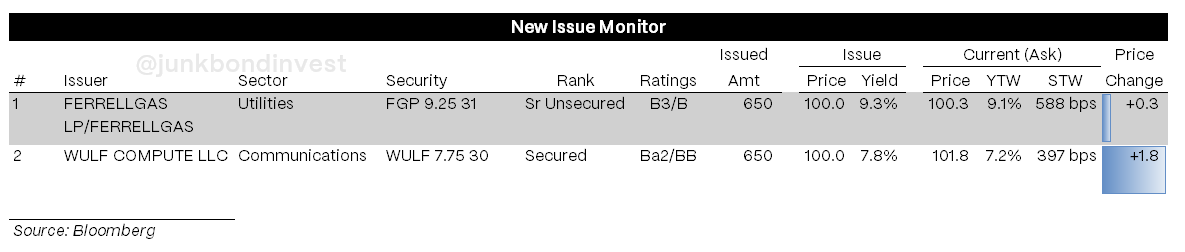 Ferrellgas was the other notable US print. The propane distributor priced $650 million 2031s at 9.0%, wider than 8.50-8.75% talk. Selectivity is creeping in at the lower end even as higher-quality paper sails through. Proceeds address 2026 maturities at a still-attractive refi level despite the concession. I wrote about the company last July; time for a refresh.