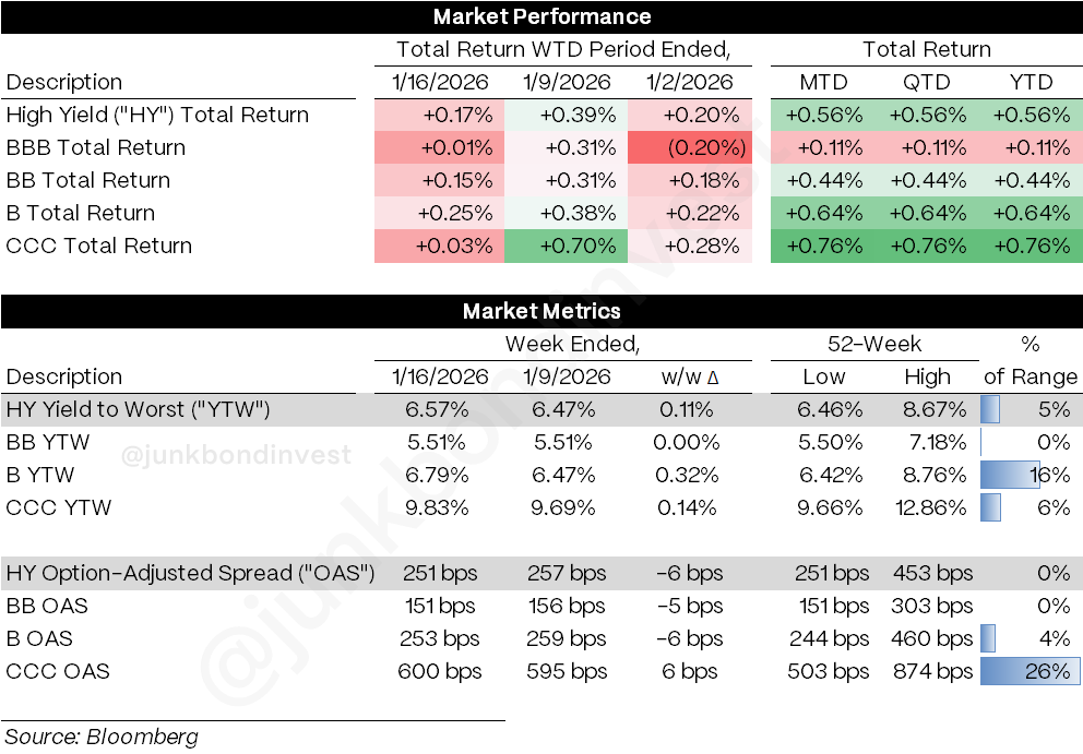 High yield returned +0.17% last week, extending the winning streak to five weeks. Spreads compressed 6bps to 251bps, the tightest since 2007. Yields ticked higher to 6.57% as Treasuries sold off. Primary slowed to $2.7 billion across five deals; Bristow upsized on a multiple-times oversubscribed book. Fund flows flipped negative. Then this weekend happened. S&P futures down 1.4% on the Greenland tariff standoff, VIX above 20, and the forward calendar may be on ice.