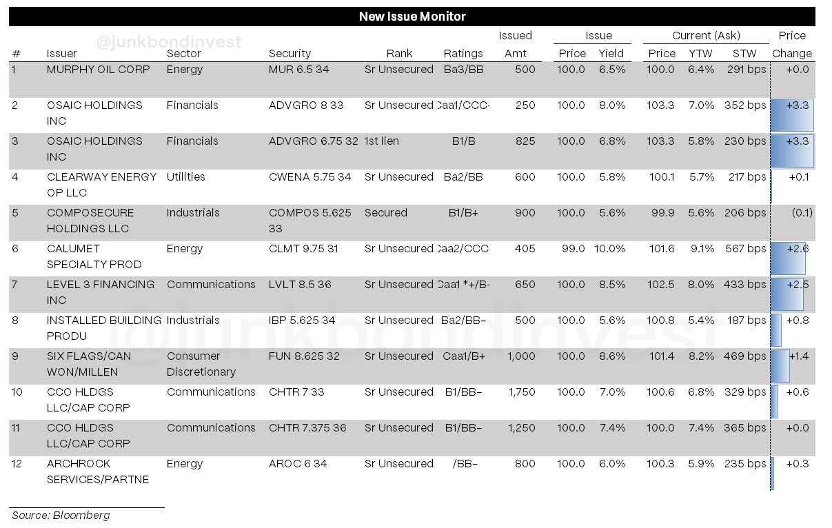 The demand showed up exactly where you would expect in a risk-on tape. CCC paper returned 0.70%, more than double the 0.31% from BBs. Four deals carried at least one CCC rating. When a Caa2/CCC+ issuer can bring paper with OID and trade up 3 points, risk appetite is not the question.