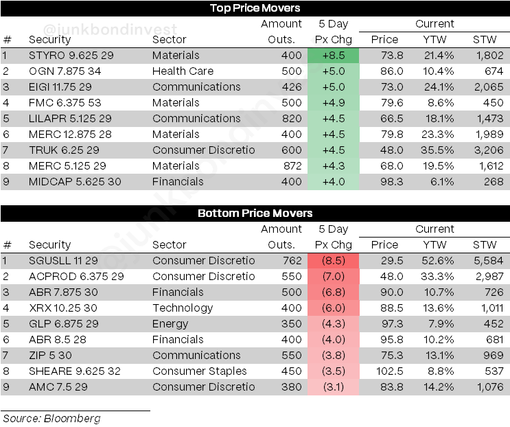 Compression was broad. All 20 HY sectors finished tighter. Chemicals, Consumer Products, and Paper and Packaging each narrowed 20 bps or more. The Russell 2000 jumped 4.6% while the S&P gained 1.6% and hit new highs, and that small-cap leadership showed up in credit as CCCs outperformed BBs by 40bps.