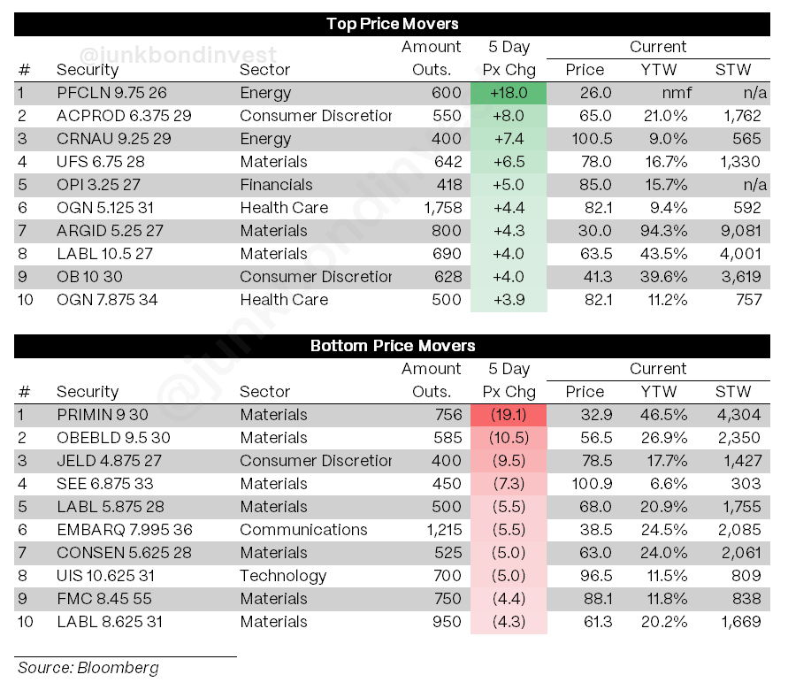 Elsewhere, packaging stayed heavy. Demand softness and upcoming maturities weighed on sentiment. Consumer finance names like Pagaya traded defensively on low-end credit worries.