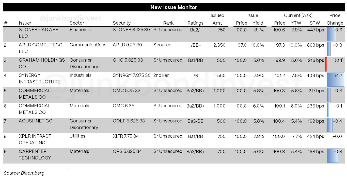 AI infrastructure stayed in focus. Applied Digital printed a $2.35b secured green bond at roughly a 10% yield and a 97 handle. The deal got done, but the aftermarket told the truth. This is no longer an “AI anything works” tape. It is now a credit selection exercise. Recent Cipher Mining and TeraWulf deals remain in the conversation because investors are starting to differentiate between projects with solid hyperscaler support and situations where execution risk is climbing.
