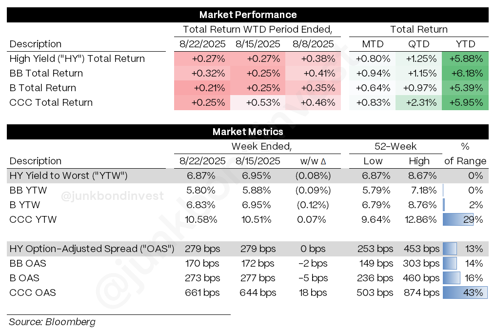 The setup was perfect: no competing supply, maximum seasonal calm, and a Fed chair basically promising September rate cuts. High yield gained +0.27% for the week while spreads held dead flat at 279bps, meaning the entire rally came from pure duration effect as Treasury yields plunged. When you eliminate new issue competition and get the Fed pivot you’ve been waiting for, this is exactly what should happen.