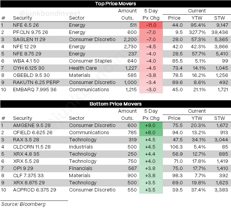 The energy sector volatility particularly around New Fortress Energy bonds reflects ongoing uncertainty around contract negotiations. When a single company can dominate the weekly decliner list across multiple issues, it highlights both the opportunity and risk in credit-specific situations.