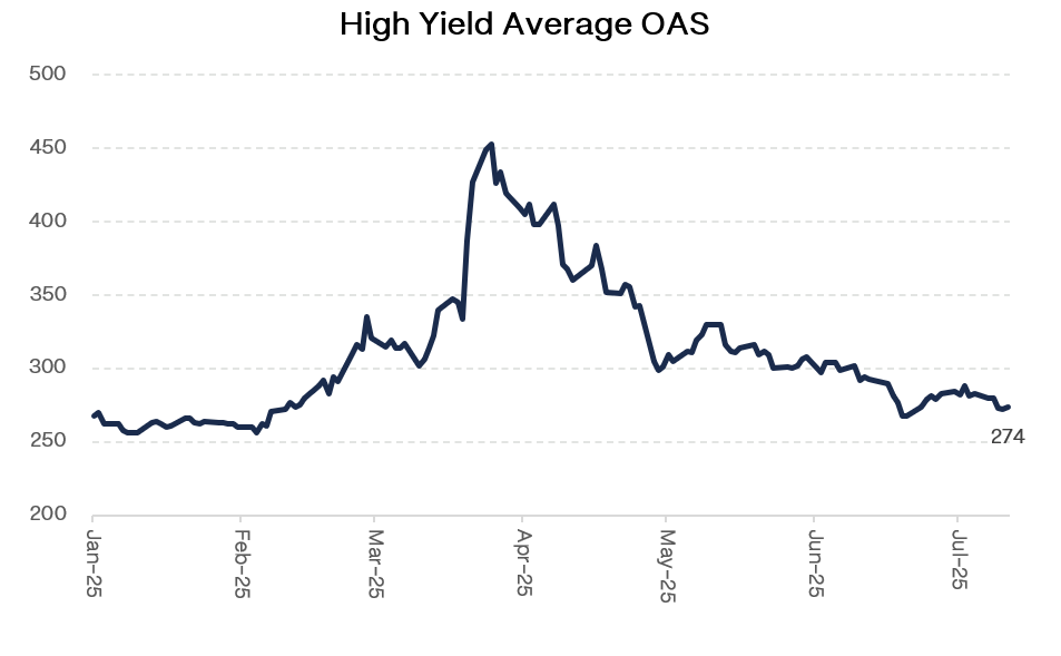 Spreads tightened 9bps to 274bps, bringing consistent weekly compression and reinforcing the technical strength that’s defined this summer rally. When companies like CoreWeave can return to market just two months after their debut and Gray Media (a TV broadcaster!) can price a second deal within weeks of their first, the primary machine isn’t just functioning but operating at peak efficiency.