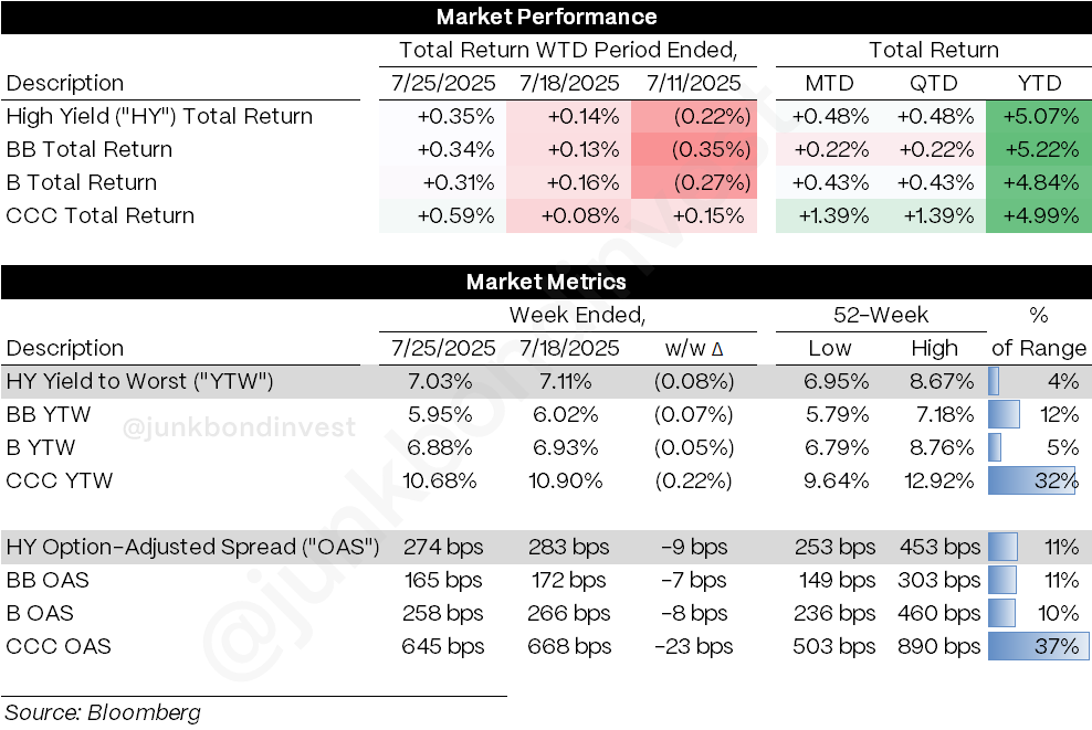 The numbers reveal a market showing clear performance leadership from the riskiest credits. HY gained +0.35%, extending the summer’s consistent performance: