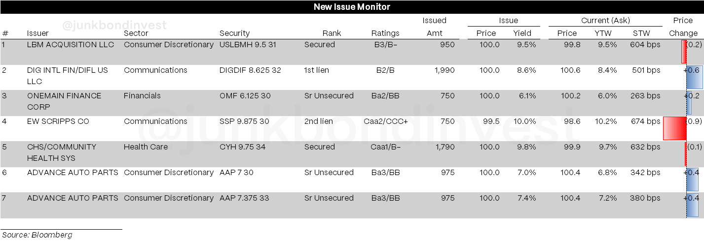 But here’s the week’s real story: the primary market was firing on all cylinders early in the week, with $8.2 billion pricing across multiple tranches before Friday’s jobs report changed everything. Community Health priced $1.8 billion at 9.75%, Digicel printed nearly $2 billion of secured notes, and Advance Auto Parts brought dual tranches totaling $1.9 billion. All of this cleared smoothly until payrolls hit and the narrative flipped overnight.