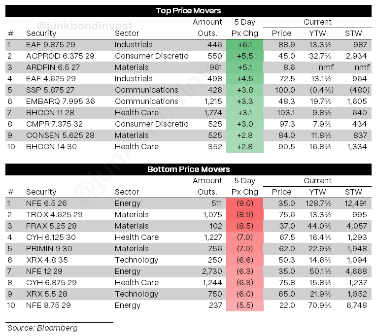 The Tronox story epitomizes the week’s tone. Bonds plunged 5 points after the company swung to a loss, hitting yields of 12.75% as investors questioned how long cost cuts could offset the demand slump. Meanwhile, JetBlue provided one of the few bright spots, jumping 3 points after narrowing losses and securing DOT approval for its United partnership.