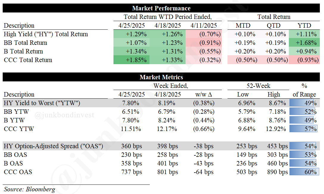As equity markets whipsawed on Powell-related drama, high yield delivered another impressive week with the index returning +1.29% as spreads tightened a remarkable 38bps to 360bps and yields held steady at 7.80%. This counter-intuitive strength has pushed YTD performance to +1.11%, confounding those who predicted lasting damage from the tariff saga.