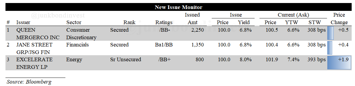 Primary markets cautiously reopened with three BB deals pricing for $4.4 billion, all generating strong demand that allowed for upsizing and pricing at the tight end of talk. Jane Street brought $1.35 billion secured notes at 6.75%, QXO priced $2.25 billion secured notes at 6.75% for its Beacon Roofing acquisition, and Excelerate Energy issued $800 million unsecured notes at 8.00%. Every deal traded up in secondary—a powerful signal that cash remains on the sidelines waiting for opportunities.