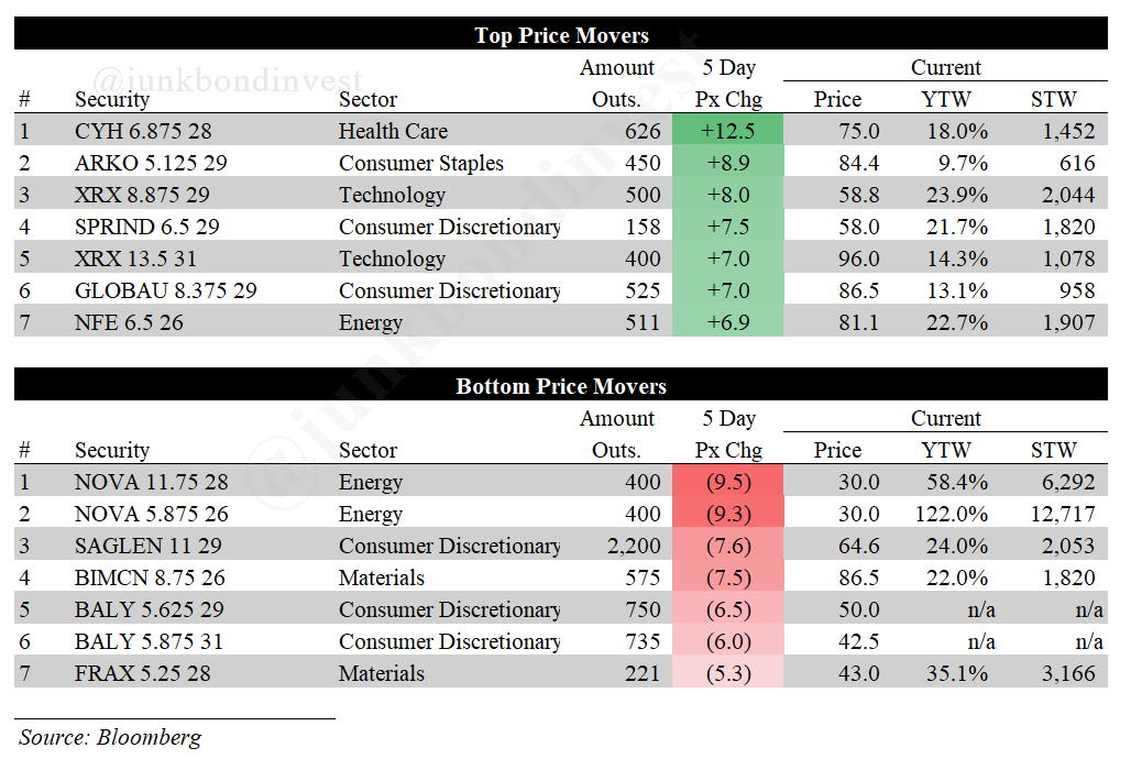 The most significant single-name story was Saks Global (SAGLEN), whose 11% 2029 notes plummeted 7.5 points after the company disclosed it was “prudently” evaluating balance sheet strengthening opportunities, including a potential FILO loan. The bonds now trade in the 60s before even paying their first coupon, highlighting the market’s continued skepticism toward highly-leveraged retailers despite the broader rally.