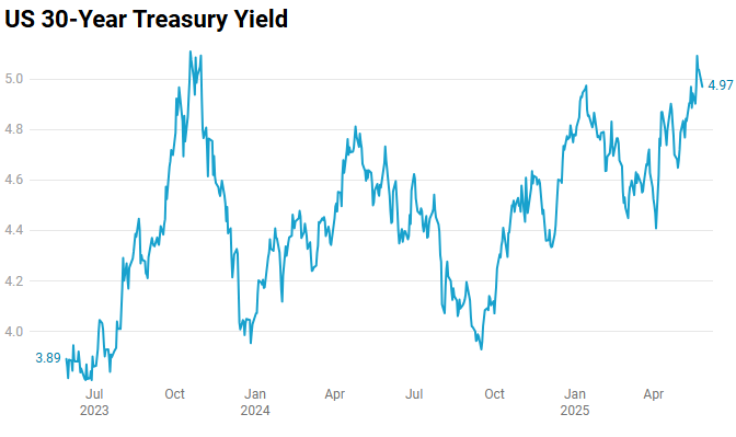 The technical damage was selective but meaningful. CCCs bore the brunt of the punishment, tumbling -0.74% for the week while BBs showed more resilience with a -0.40% decline. Lower-quality credits that had led the recent surge suddenly found themselves abandoned as investors rotated back toward quality. In addition, 30-year treasury yields came within 3bps of taking out their October 2023 highs, threatening levels not seen since mid-2007.