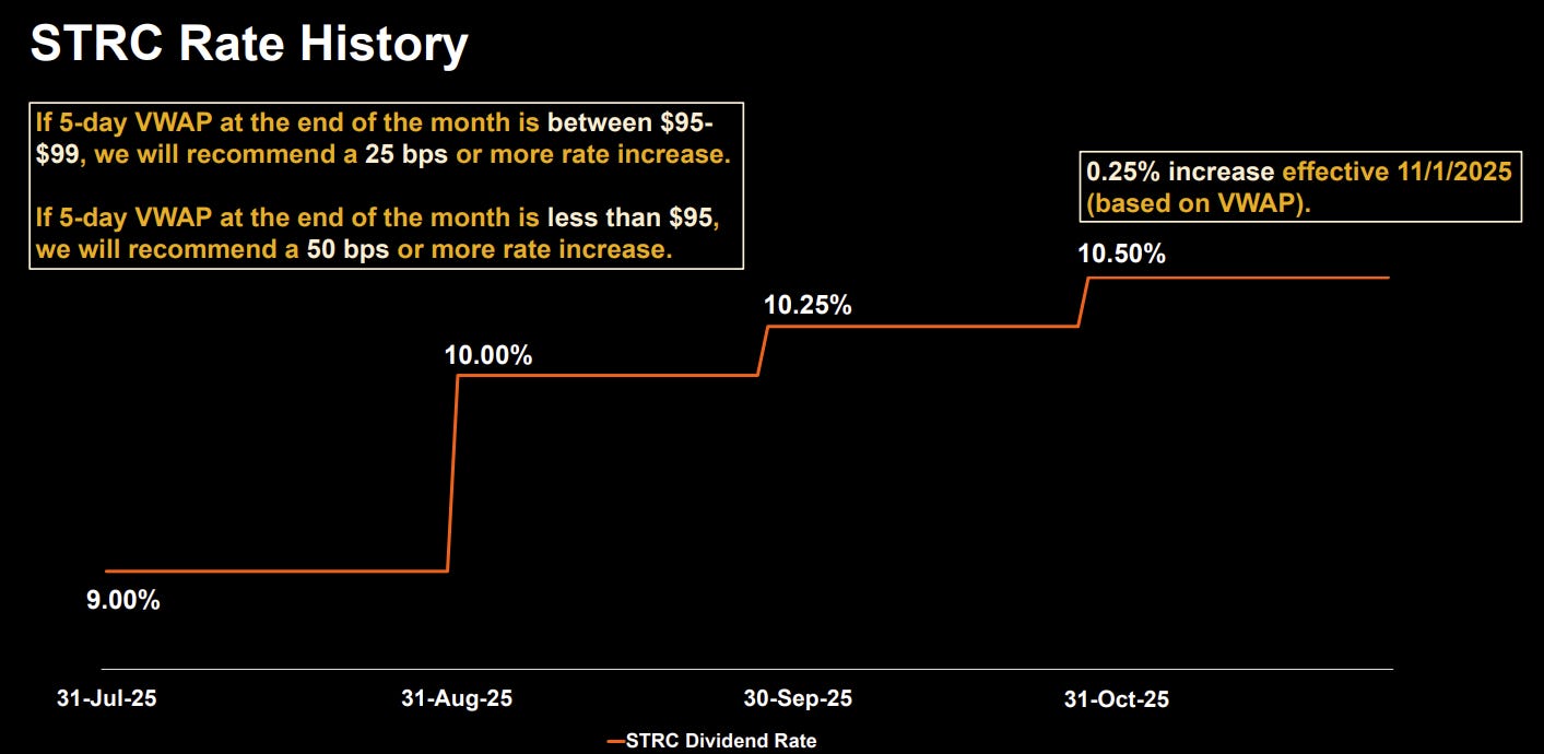 Below that sits STRK. STRK pays 8% and is cumulative, but its real purpose is the conversion feature into MSTR at a high strike. You give up 200 bps of coupon for a long-dated call option on the equity if the flywheel ever returns. It is not a credit instrument. It is a hybrid designed for people who want structured upside more than income.
