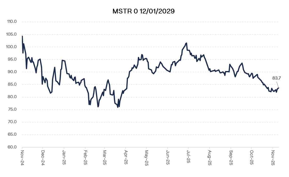 The 2029s highlight this clearly. The strike is $672, miles above the current share price of $178, so the notes behave like high yield credit, trading around 83 or ~375 bps STW. On the other side you have the in-the-money (ITM) 0.625s 2030s with a $150 strike that trade around 140 because the embedded option is essentially all equity. They run at 80 delta and move almost share-for-share. Convert-arb funds buy the bond, short the delta amount of MSTR, and capture credit, carry, and vol. Everything else in the convert stack just slots somewhere between “straight bond with optionality” and “equity in disguise.”