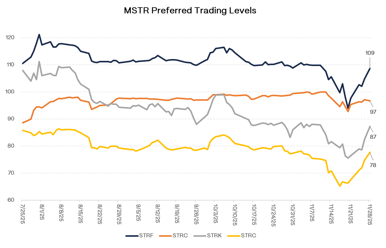 Put simply: STRF and STRC are the senior income workhorses, STRE is the middle cumulative EURO line with step-up protection, STRK is the equity-optional hybrid, and STRD is the high-octane yield piece at the bottom. The reality of this waterfall is reflected in the preferred trading levels as shown below.