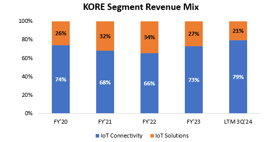 It’s a model that’s found its market. Today, KORE manages 18.8 million connected devices for 3,600 customers across healthcare, asset tracking, and fleet management. The business breaks down into two segments: Connectivity (79% of revenue), providing cellular access across carrier networks, and IoT Solutions (21%), handling device management and analytics.